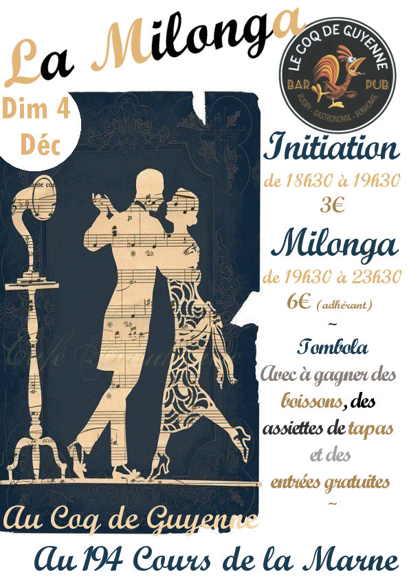 ango Argentin le 4 Décembre Milonga et Initiation au Coq De Guyenne avec TangoHoy Venez participer à la dernière Milonga de l'année Organisée par TangoHoy et musicalisé par votre serviteur! Dj Arlequin. Une initiation de 18h30 à 19h30. & à 19H30 la Milonga jusqu'à 23h30 Au menu divers Tapas et Boissons toutes plus exquises les unes que les autres à petit prix! Comme à son habitude L'association vous fera participer à sa tombola avec à gagner des boissons, des assiettes de tapas. Alors à Dimanche 4 Décembre!!!